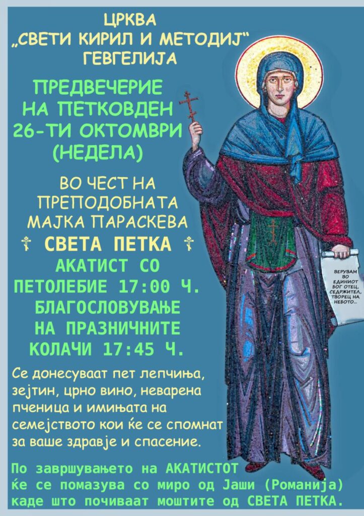 во недела, 26 октомври, во Црквата „Св. Кирил и Методиј“ во Гевгелија ќе се одржи духовна служба со која ќе се одбележи предвечерието на големиот христијански празник Петковден.